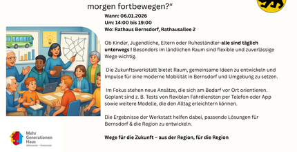 Die zukünftige Gestaltung der Mobilität in Bernsdorf und der umliegenden Region steht im Mittelpunkt einer offenen Zukunftswerkstatt. Ziel der Veranstaltung ist es, gemeinsam neue Ideen und Lösungsansätze zu entwickeln, die den Bedürfnissen aller Generationen gerecht werden.