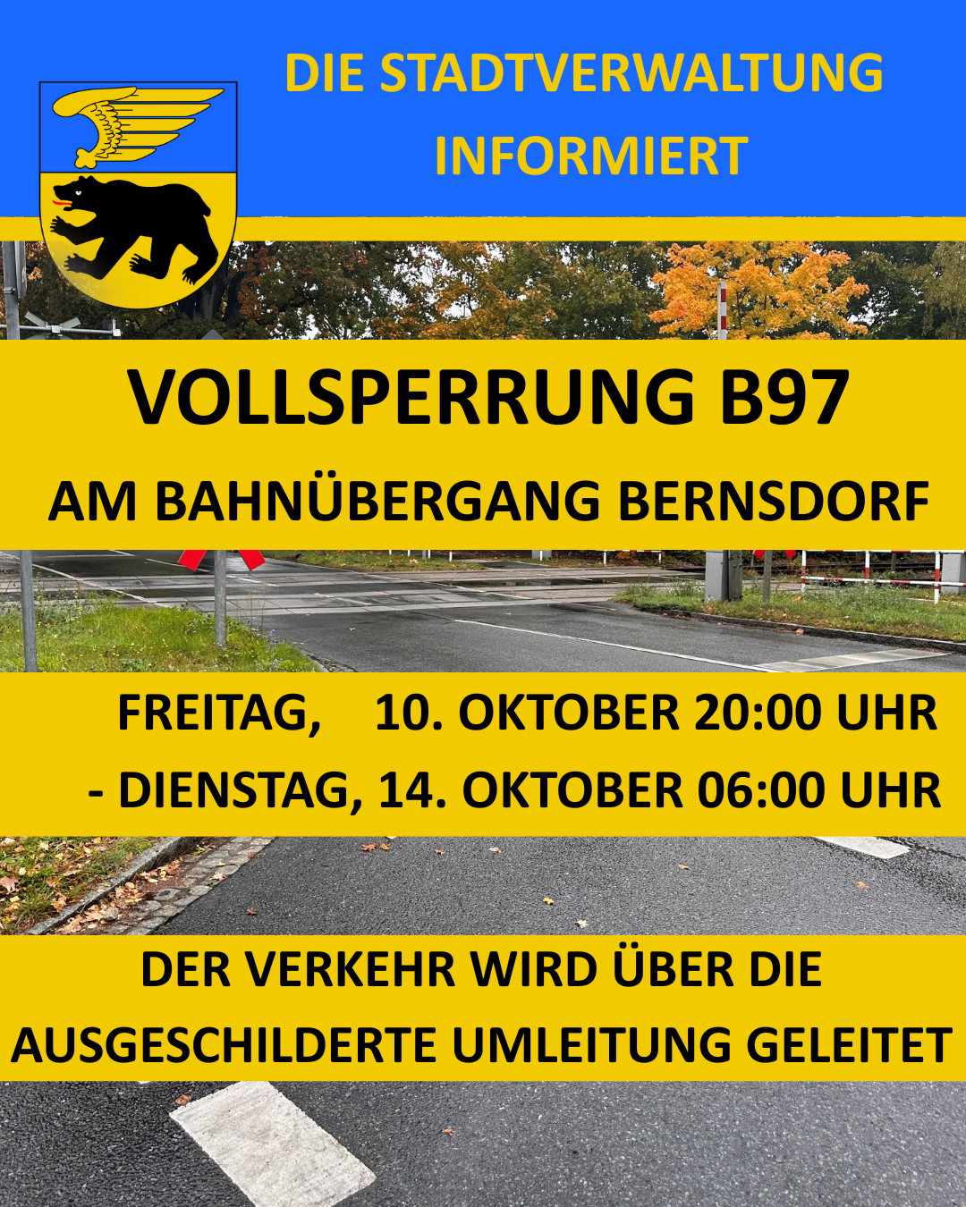 Aus diesem Grund ist eine vollständige Sperrung der B 97 im Bereich des Bahnübergangs vom Freitag, 10. Oktober 2025, 20:00 Uhr bis Dienstag, 14. Oktober 2025, 06:00 Uhr erforderlich.